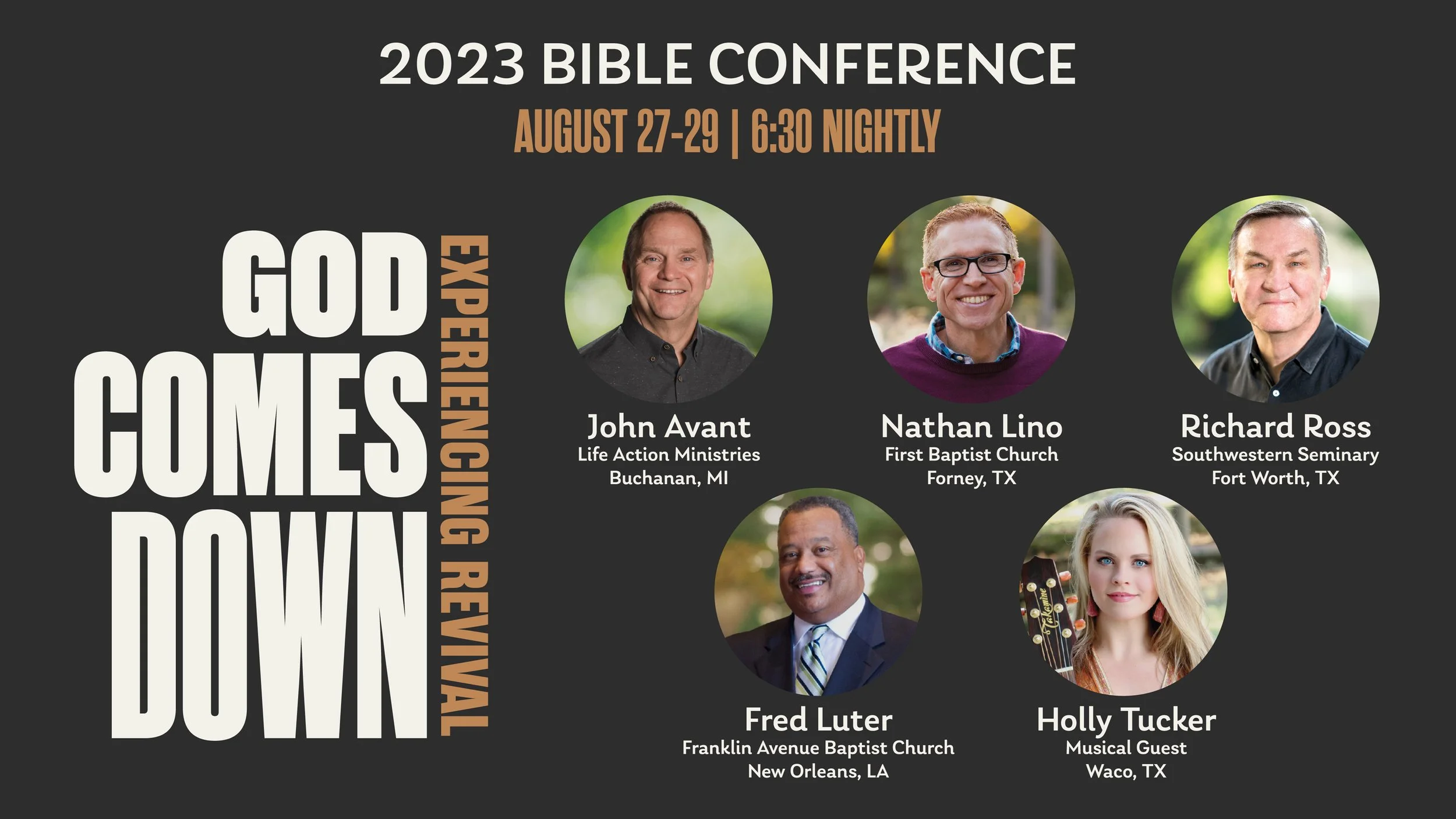 Join us for our much anticipated 2023 Bible Conference on the NRH Campus, August 27-29 at 6:30 PM.